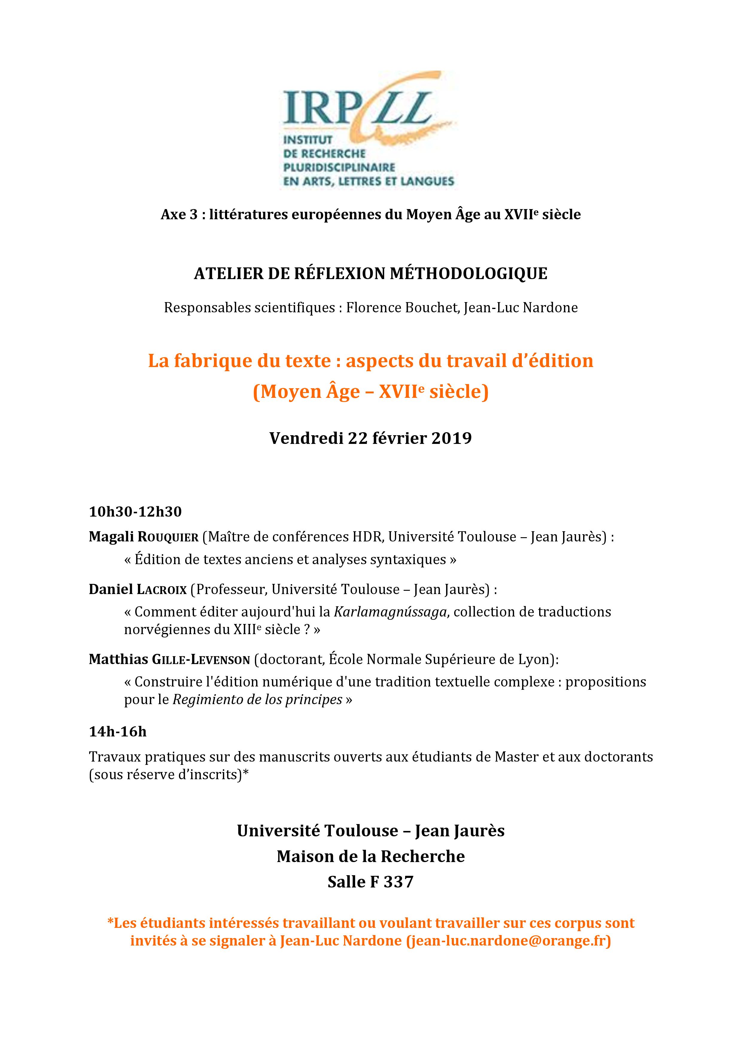La fabrique du texte : aspects du travail d'édition (Moyen Âge - XVII° siècle) - 22/02/2019